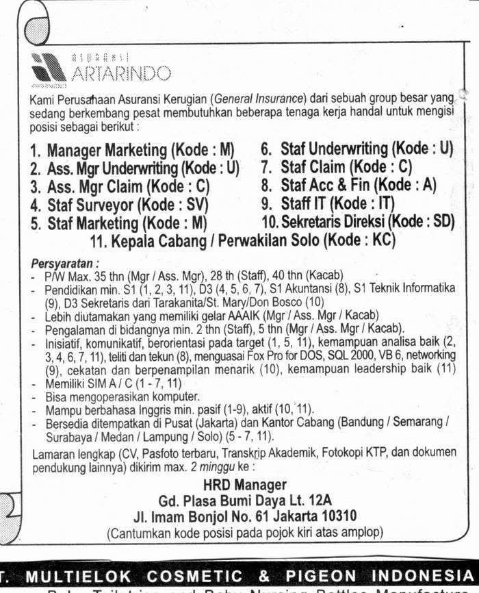 Kami perusahaan Asuansi Kerugian (general insurance) membutuhkan beberapa tenaga kerja handal untuk posisi sebagai berikut:
