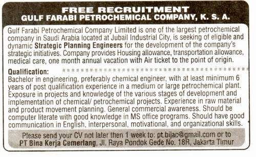 Gulf Farabi Petrochemical Company Limited is one of the largest petrochemical company in Saudi Arabia located at Jubail Industrial City, is seeking of eligible and dynamic STARTEGIC PLANNING ENGINEERS for the development of the company's strategic initiatives. Company provides Housing allowance, transportation allowance, medical care, one month vacation with Air ticket to the point of origin.