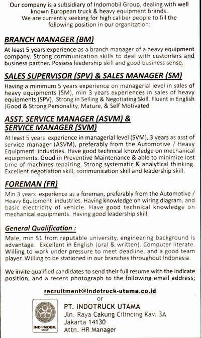 Our company is a subsidiary of Indomobil Group, dealing with well-known European truck & heavy equipment brands. we are currently seeking for high caliber people to fill the following position in our organization: